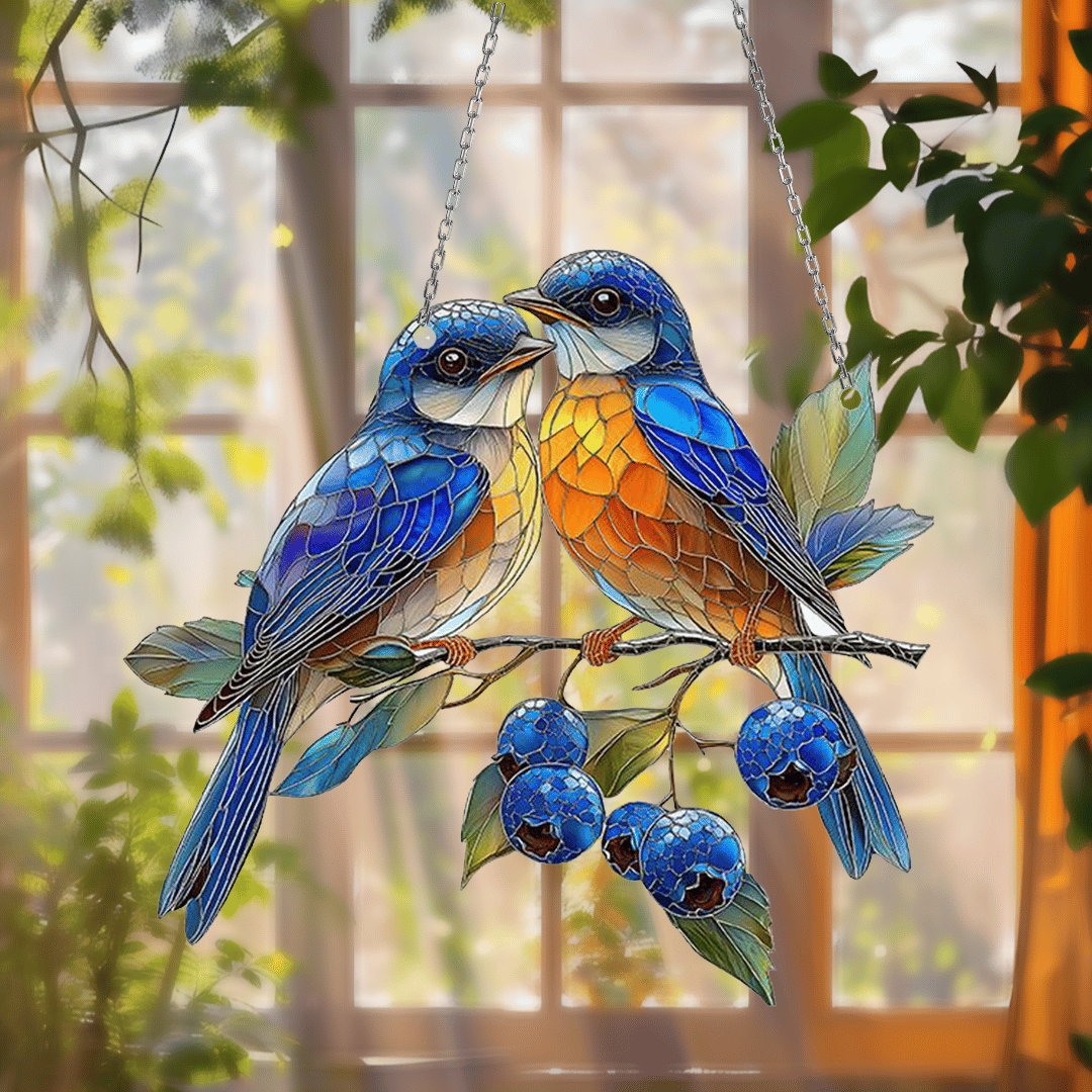 The two bluebirds, delicately perched on a branch with berries, symbolize love, companionship, and harmony. Their elegant design and vibrant hues bring a heartwarming touch to any environment.