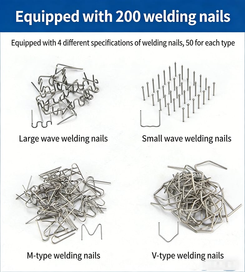 🧰 Complete Repair Kit: Includes 200pcs staples (4 types: large wave, small wave, M-type, V-type, 50pcs each) in a storage box for all your welding needs.