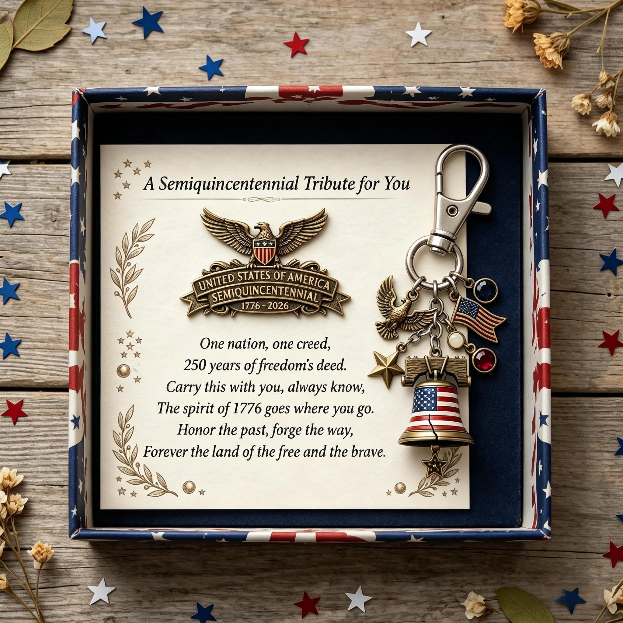 A bold, detailed metal pin featuring the iconic Great Seal of the United States eagle, engraved with UNITED STATES OF AMERICA, SEMIQUINCENTENNIAL, and the historic years 1776–2026. - 🔑Liberty Bell & Flag Keychain
