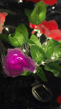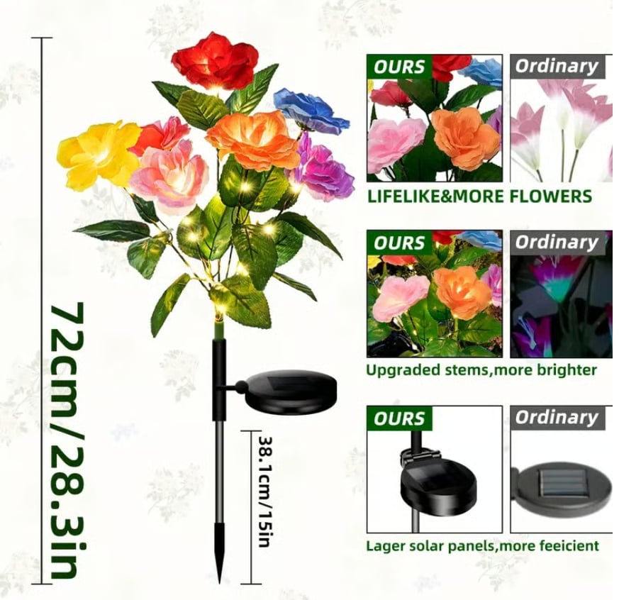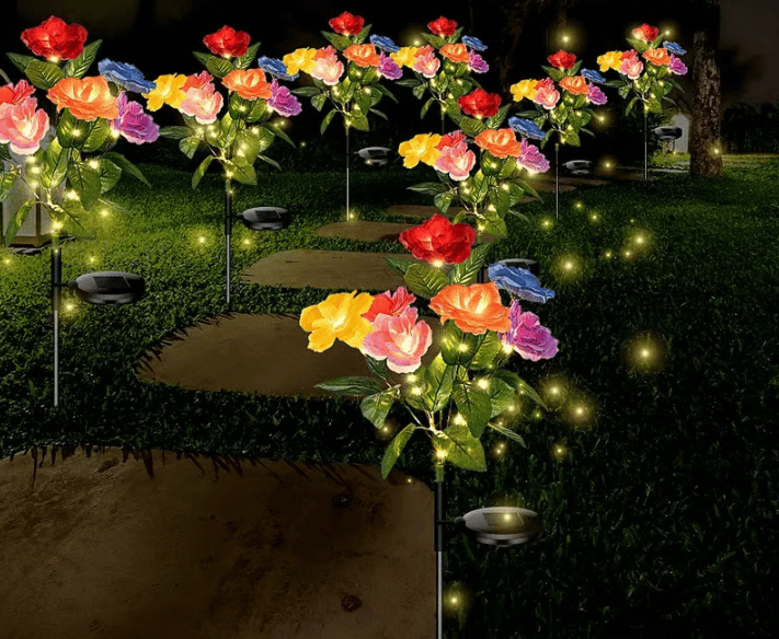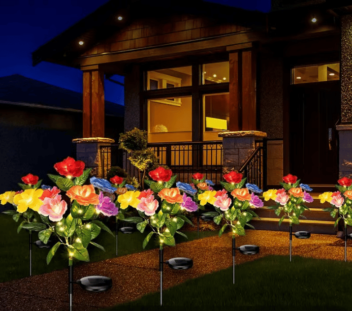 🌷 Day & Night Charm: By day, lifelike multi-hued seven-headed roses (red, yellow, pink, purple, blue) add a cheerful pop of color. By night, built-in LEDs softly glow from within the petals, transforming your yard into a magical escape.