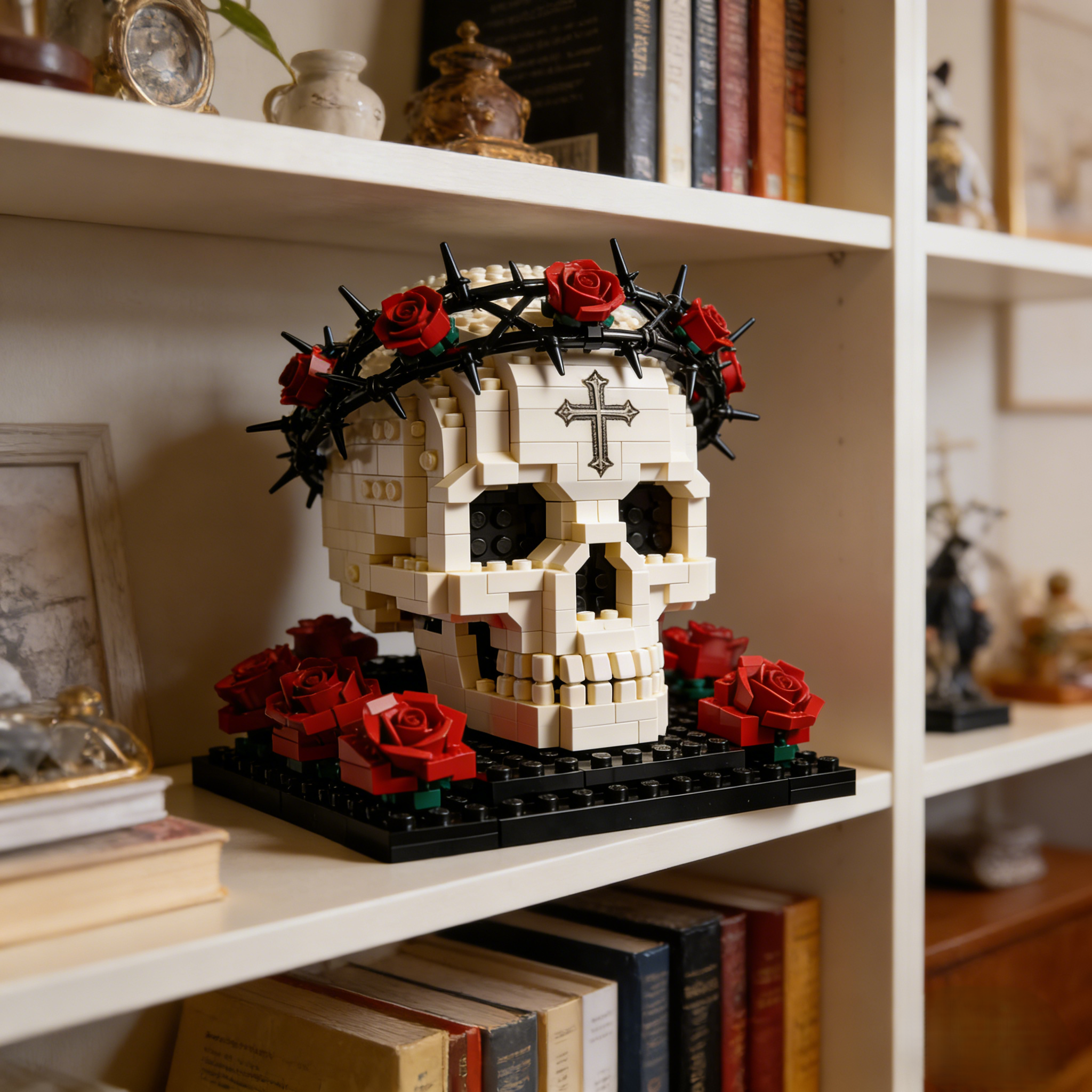 Every brick captures intricate details of the skull’s texture, the sharp elegance of the thorned crown, and the lifelike petals of surrounding roses. Perfect for builders who appreciate a gothic aesthetic, dark romance, and fine craftsmanship.